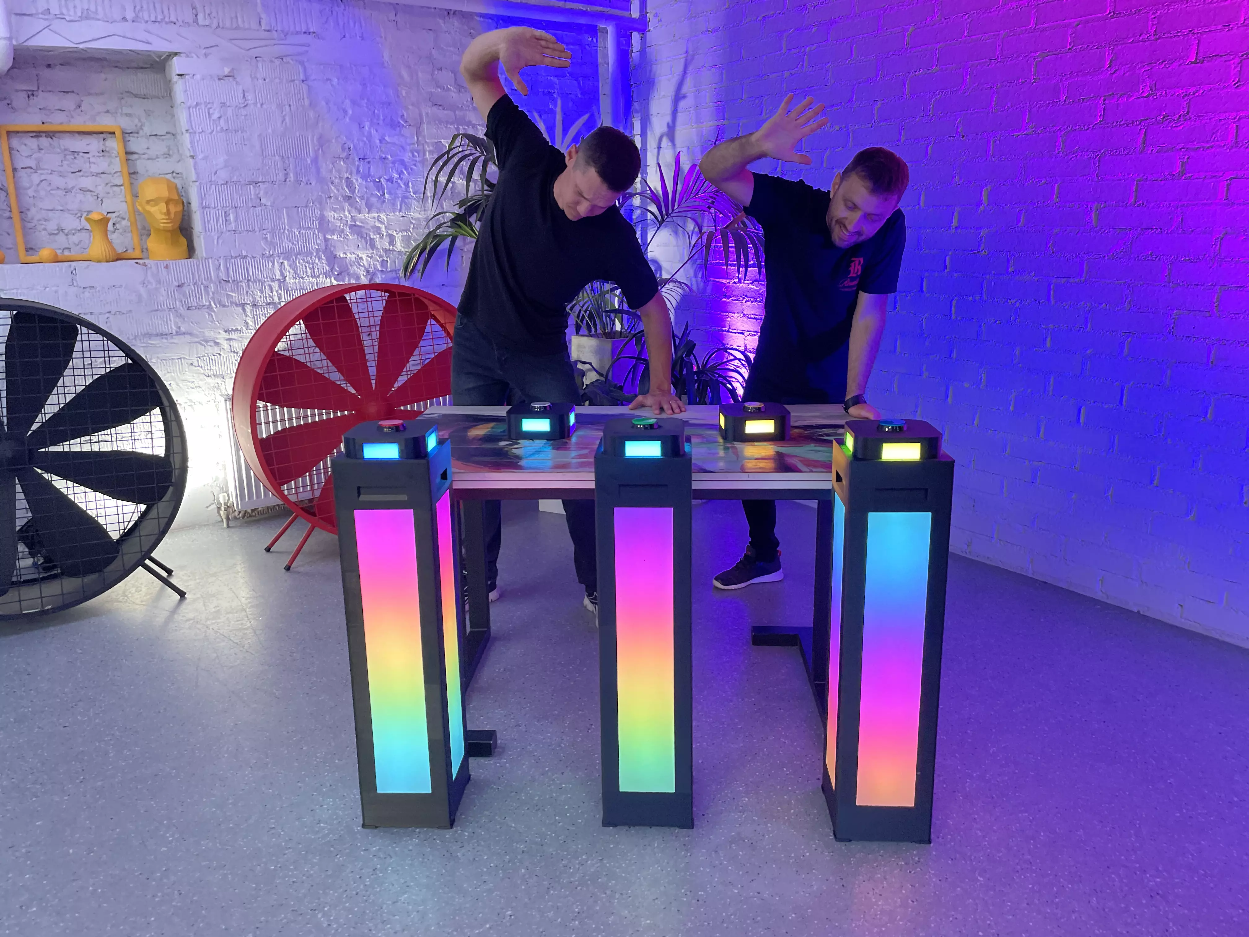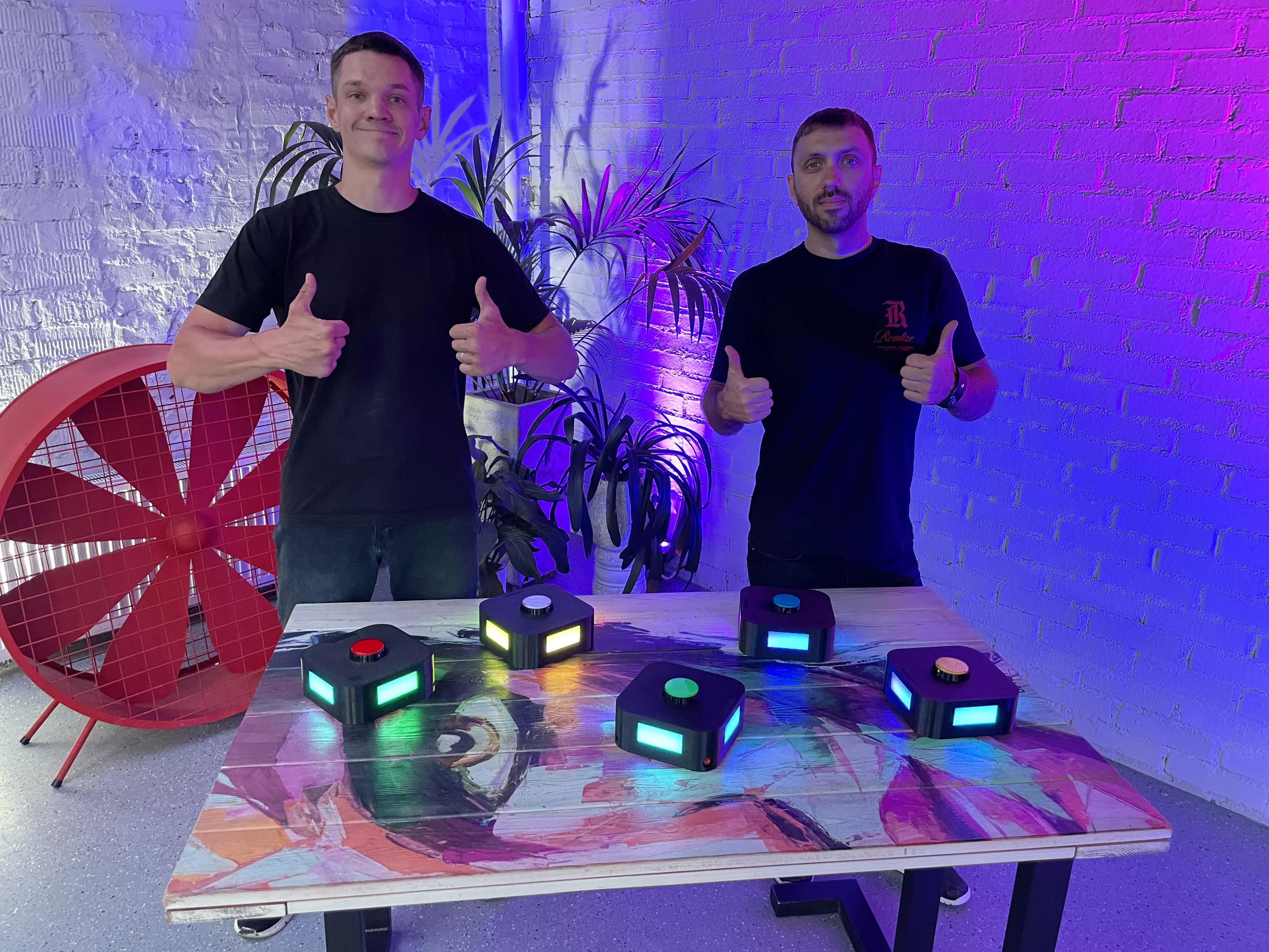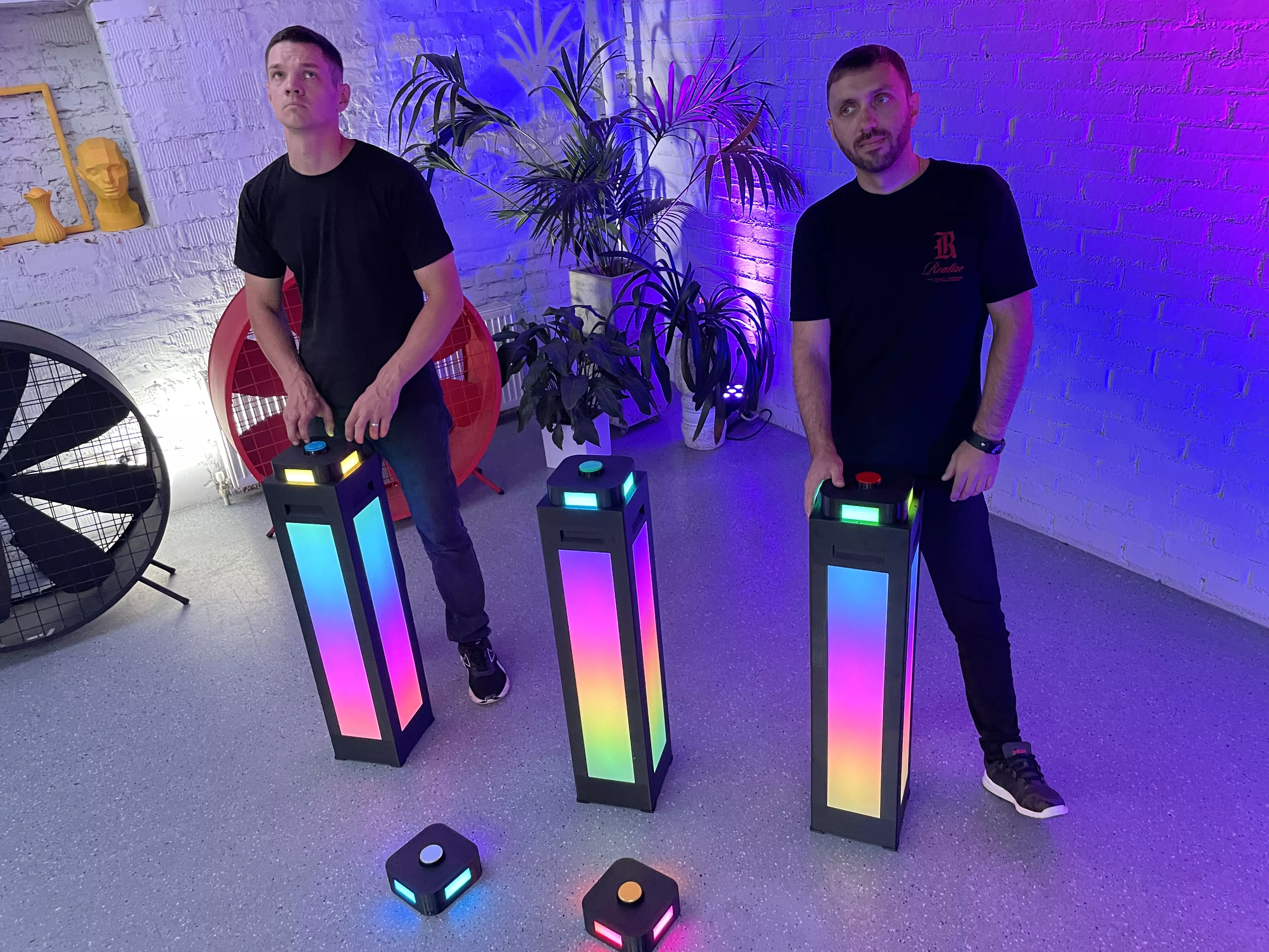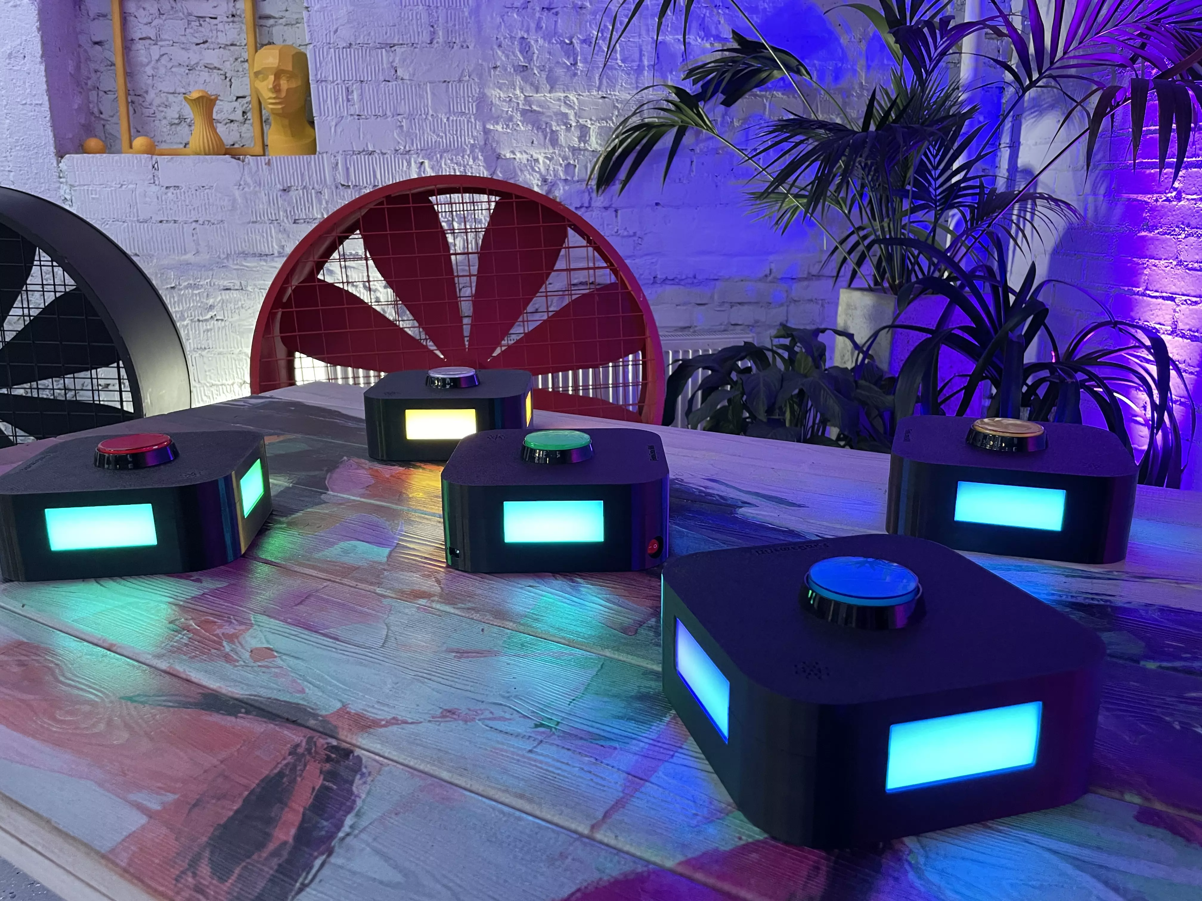 БЕСПРОВОДНЫЕ КНОПКИ и ТУМБЫ для проведения викторин. Кнопки интегрируются в тумбы и работают, как единое целое, тем самым обозначаются светом и звуком игрока, который первый нажал на кнопку. Все остальные кнопки и тумбы при этом уже не реагируют на нажатие и гаснут.