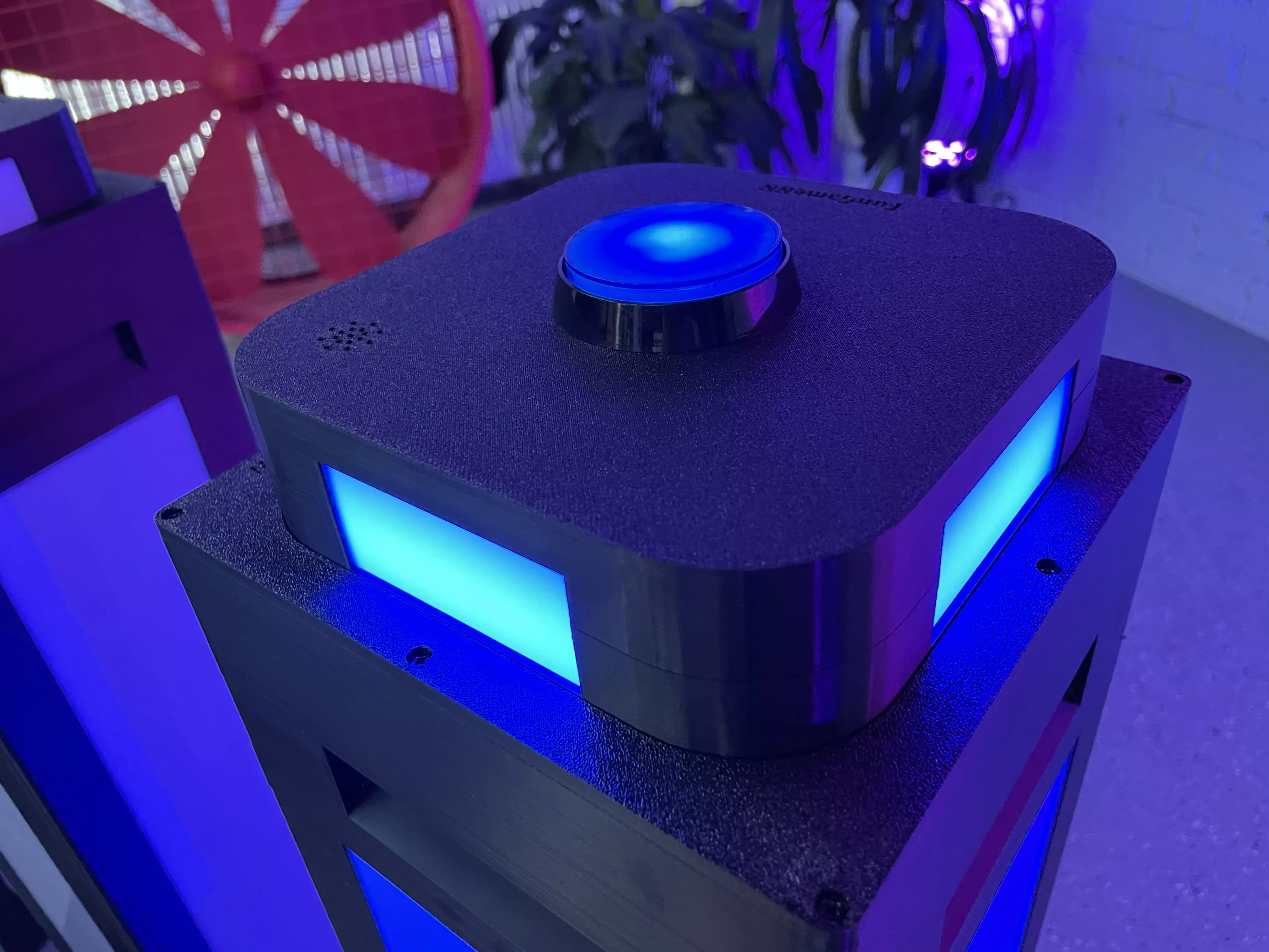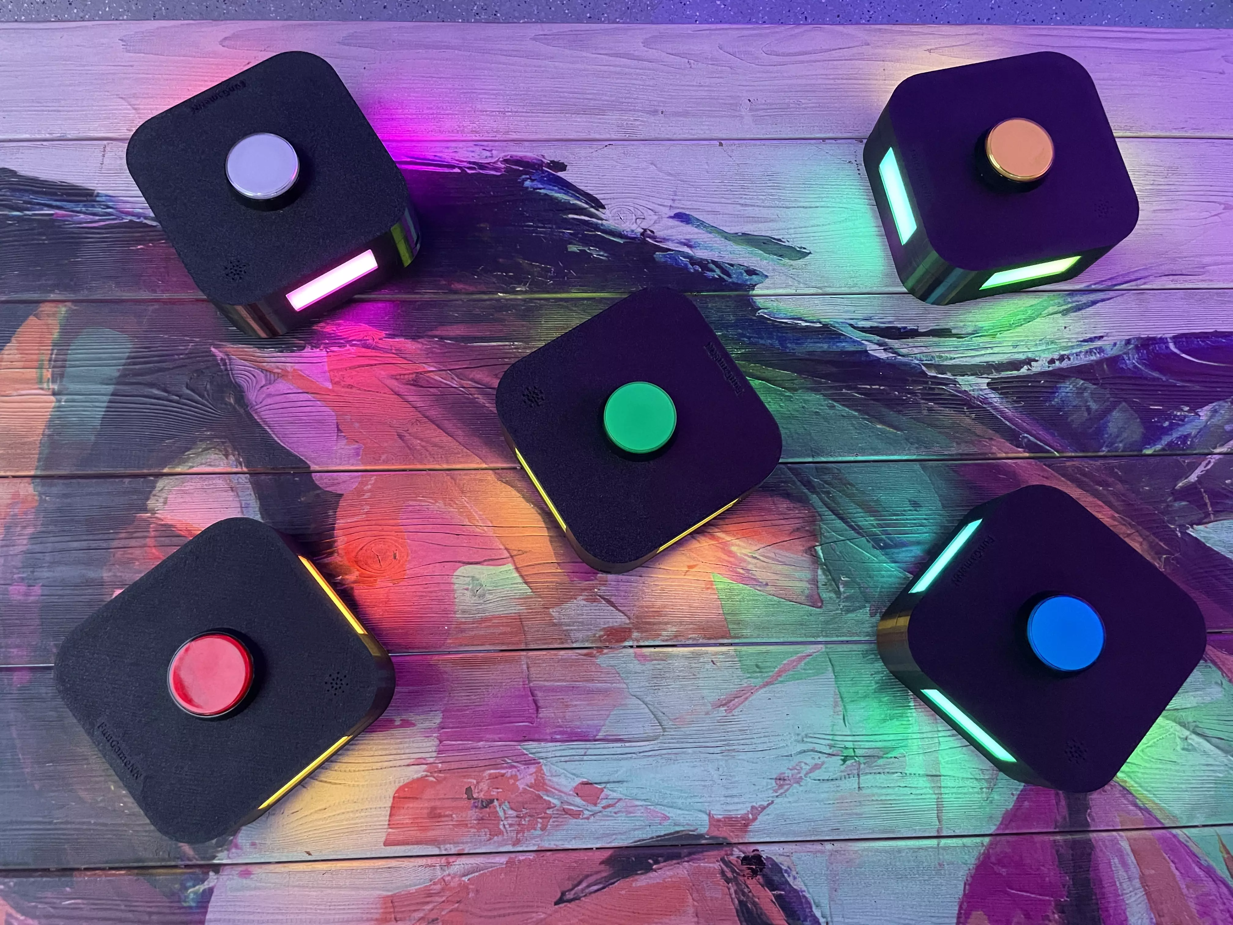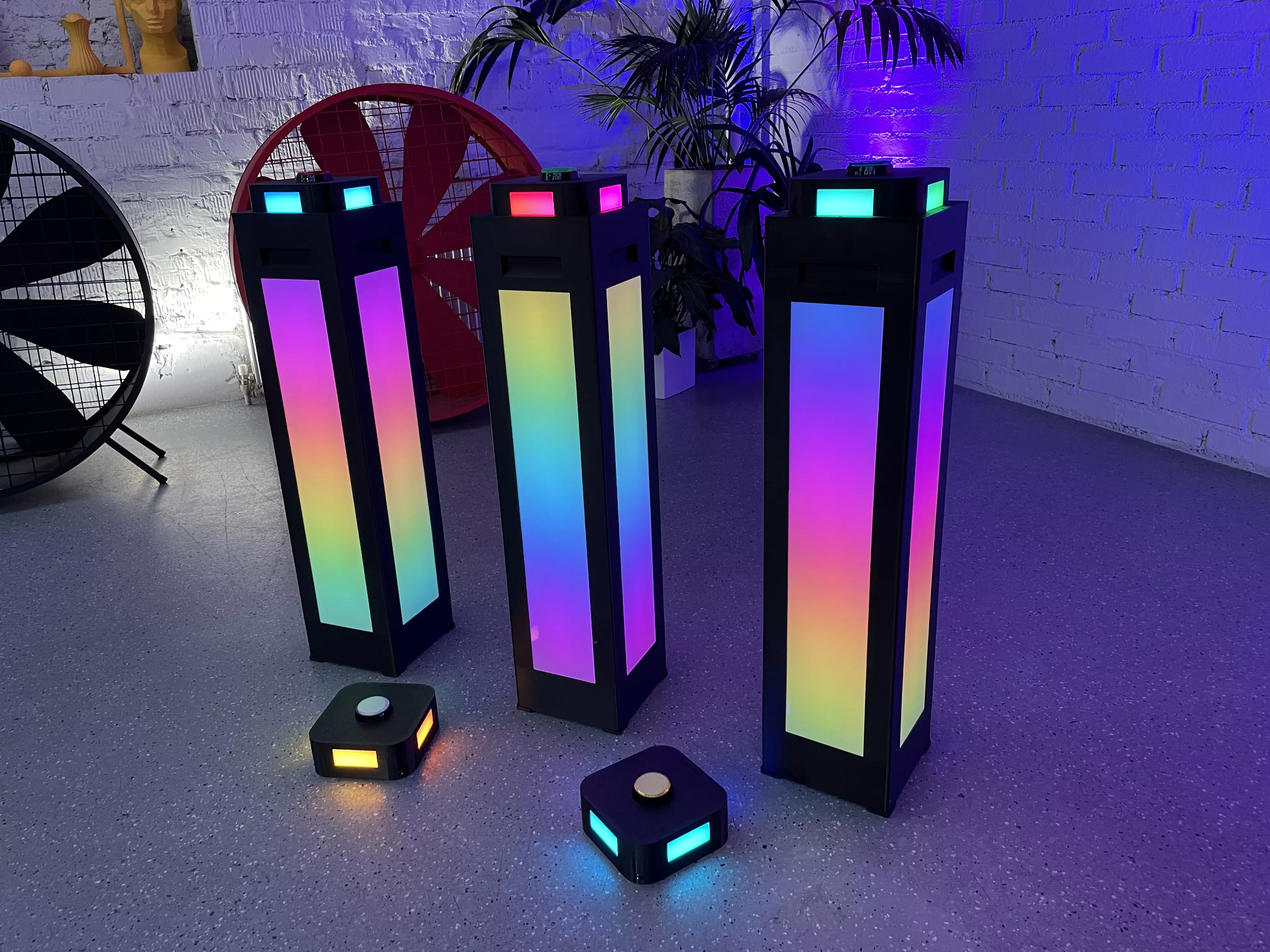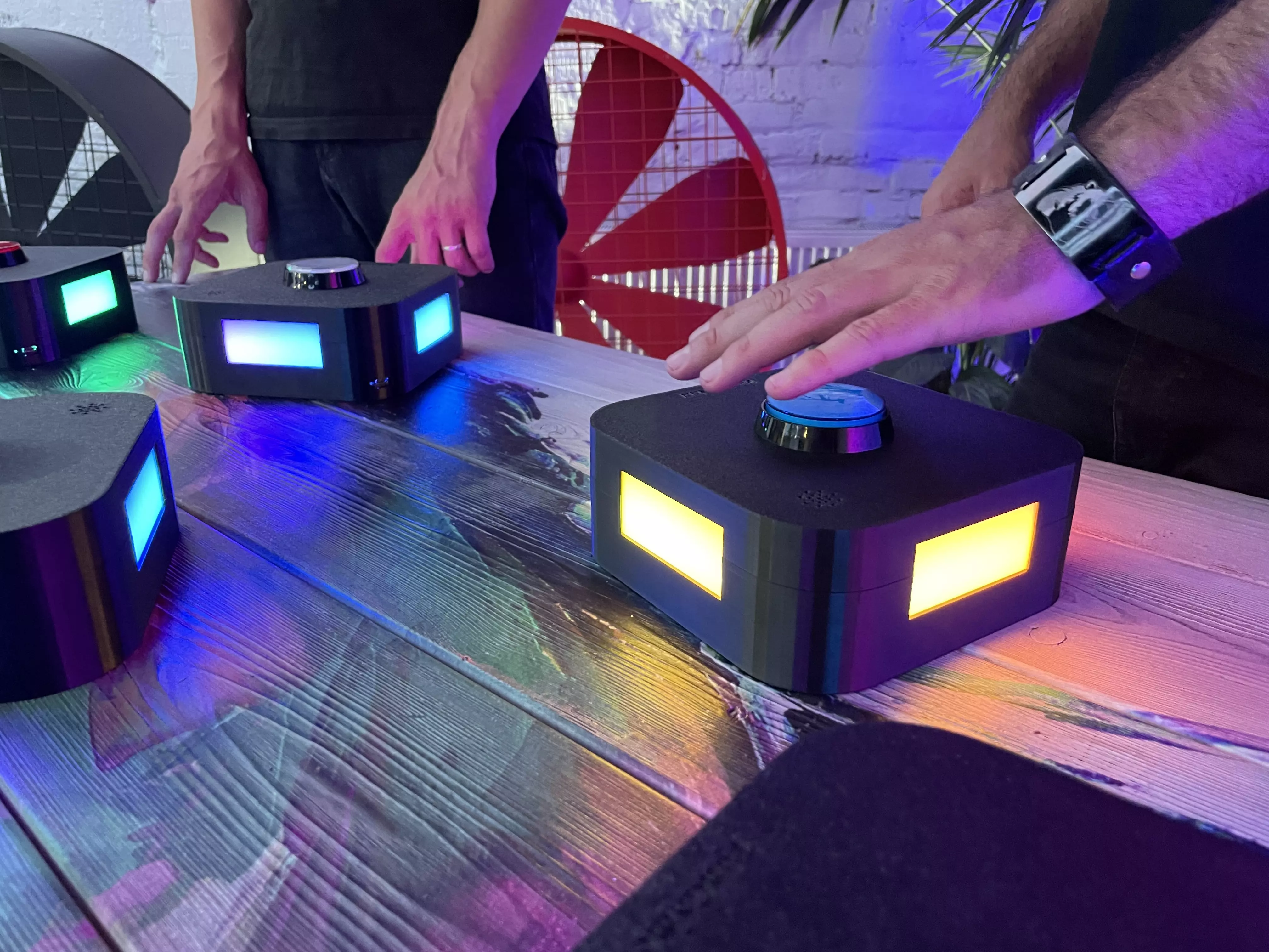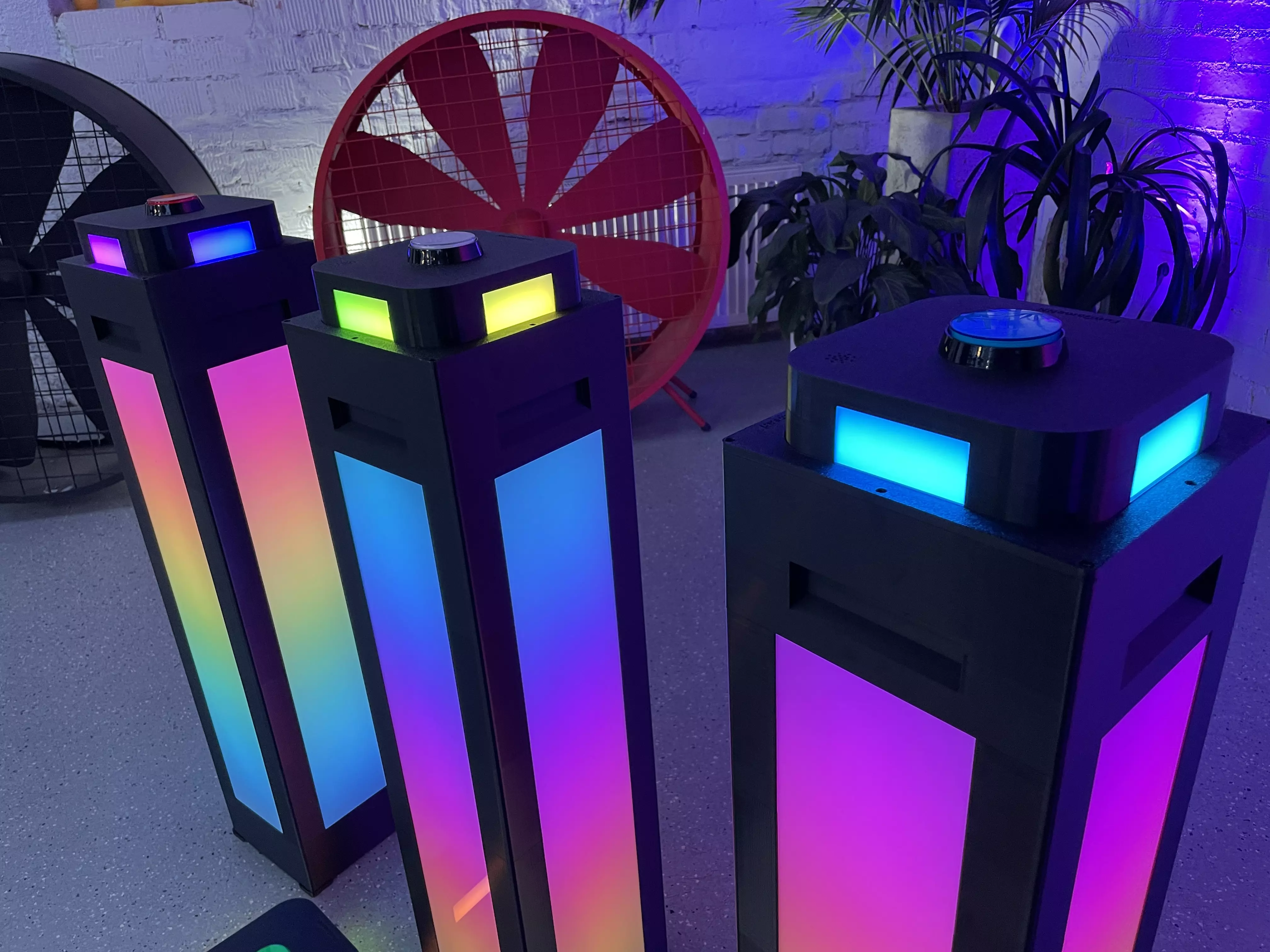БЕСПРОВОДНЫЕ КНОПКИ и ТУМБЫ для проведения викторин. Кнопки интегрируются в тумбы и работают, как единое целое, тем самым обозначаются светом и звуком игрока, который первый нажал на кнопку. Все остальные кнопки и тумбы при этом уже не реагируют на нажатие и гаснут.